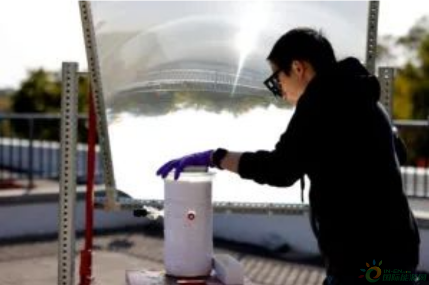 Figure 2. 周鵬用一個(gè)大透鏡將陽(yáng)光聚集到水分解催化劑上。在戶外,該設(shè)備的效率是之前太陽(yáng)能分解水的十倍