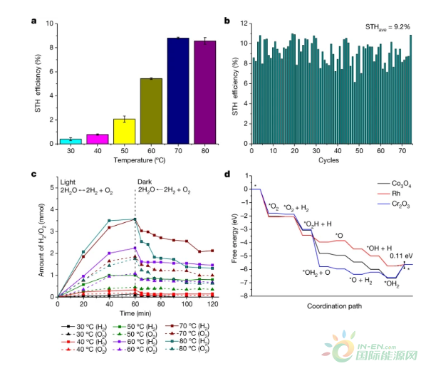 機(jī)理研究發(fā)現(xiàn)(圖2):體系中存在氫氧復(fù)合反應(yīng)(該反應(yīng)被考慮是制約光催化全解水達(dá)到最大STH效率的主要因素之一),同時(shí)70 ℃對(duì)氫氧復(fù)合具有最佳的抑制作用。此外DFT模擬證實(shí)了Rh是氫氧復(fù)合反應(yīng)的主要活性中心,且表明該反應(yīng)為放熱反應(yīng),因此在熱力學(xué)上適當(dāng)增加溫度可以抑制Rh位點(diǎn)上氫氧復(fù)合反應(yīng)的進(jìn)行。但當(dāng)反應(yīng)溫度超過(guò)80 °C時(shí),氫氧復(fù)合趨勢(shì)增高,這是由于溫度的進(jìn)一步升高導(dǎo)致了氫和氧的擴(kuò)散系數(shù)提高,加速了水中的傳質(zhì),而這種傳質(zhì)在氫氧復(fù)合中占主導(dǎo)地位,因此適當(dāng)提高溫度可以抑制光催化全解水反應(yīng)中氫氣和氧氣復(fù)合,且最佳反應(yīng)溫度為70 °C。