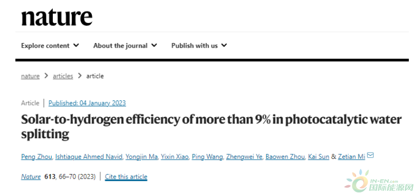 鑒于此,美國(guó)密歇根大學(xué)的米澤田教授團(tuán)隊(duì)開(kāi)發(fā)了一種策略,利用純水、集中的太陽(yáng)光和氮化鎵銦光催化劑,實(shí)現(xiàn)了高達(dá)9.2%的STH效率,該策略模仿了自然光合作用中的關(guān)鍵步驟。戶外實(shí)驗(yàn)表明它代表了該技術(shù)的一個(gè)重大飛躍,比同類(lèi)的太陽(yáng)能分水實(shí)驗(yàn)的效率高出近10倍。具體而言,研究人員通過(guò)高強(qiáng)度聚焦太陽(yáng)光產(chǎn)生的紅外熱效應(yīng)在InGaN/GaN表面的光催化全解水過(guò)程中不僅促進(jìn)了正向的水分解反應(yīng),而且抑制了逆向的氫氧復(fù)合反應(yīng),該策略使InGaN納米線表現(xiàn)出了超高的光催化全解水效率。相關(guān)研究成果以題為“Solar-to-hydrogen efficiency of more than 9% in photocatalytic water splitting”發(fā)表在最新一期《Nature》期刊上。