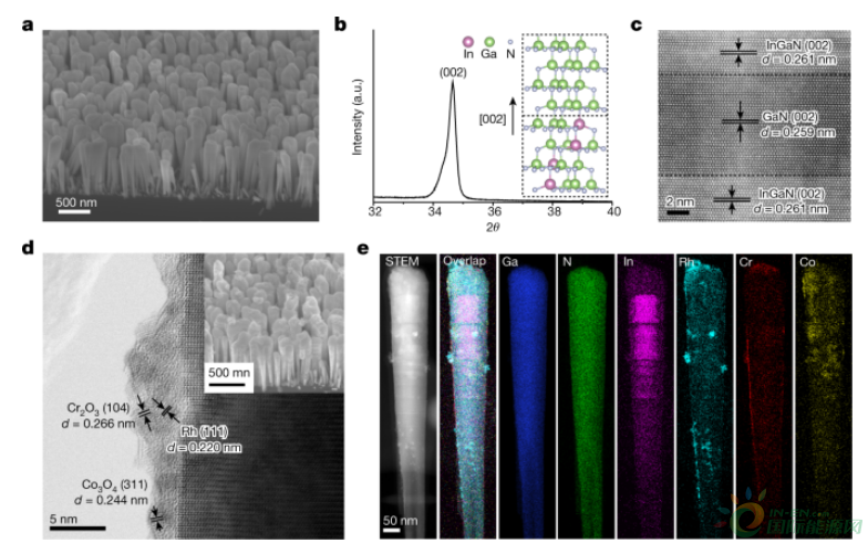 研究人員通過(guò)分子束外延生長(zhǎng)技術(shù)在商業(yè)硅片上制備了具有高結(jié)晶度和寬可見(jiàn)光響應(yīng)范圍(<632nm)的InGaN/GaN納米線光催化劑。InGaN/GaN納米線在硅晶片上排列良好,具有高結(jié)晶度,長(zhǎng)度約為1.2μm(圖1a, b)。此外,觀察到厚度約為10nm的GaN作為覆蓋層來(lái)支撐InGaN,表明InGaN/GaN納米線的原子構(gòu)型可控(圖1c)。其中,Rh/Cr2O3核/殼和Co3O4納米粒子在InGaN/GaN納米線上被光還原,并分別充當(dāng)氫和氧生產(chǎn)的助催化劑(圖1d, e)。由于成分拉動(dòng)效應(yīng),InGaN/GaN納米線中In的分布隨生長(zhǎng)方向而變化,導(dǎo)致能帶隙發(fā)生較大變化,從而導(dǎo)致寬帶光吸收。