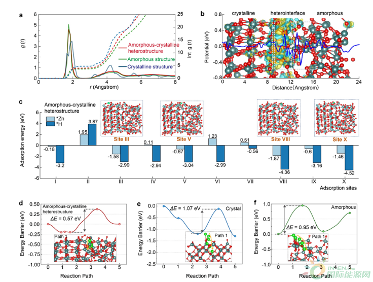 DFT理論計(jì)算及分子動(dòng)力學(xué)模擬顯示,無定型-結(jié)晶異質(zhì)結(jié)構(gòu)的V-O配位環(huán)境與純無定型或結(jié)晶態(tài)材料不同。界面處電荷分布不均,形成局域電場(chǎng),可能加速界面處電荷傳遞。此外,由于界面處原子重拍,異質(zhì)結(jié)構(gòu)電極表面具有更多的端基氧,利于Zn2+/H+離子的吸附。比之純相樣品,異質(zhì)界面模型的離子遷移能壘更低,這表明Zn2+/H+在無定型-結(jié)晶界面處具備更快的傳質(zhì)動(dòng)力學(xué)。